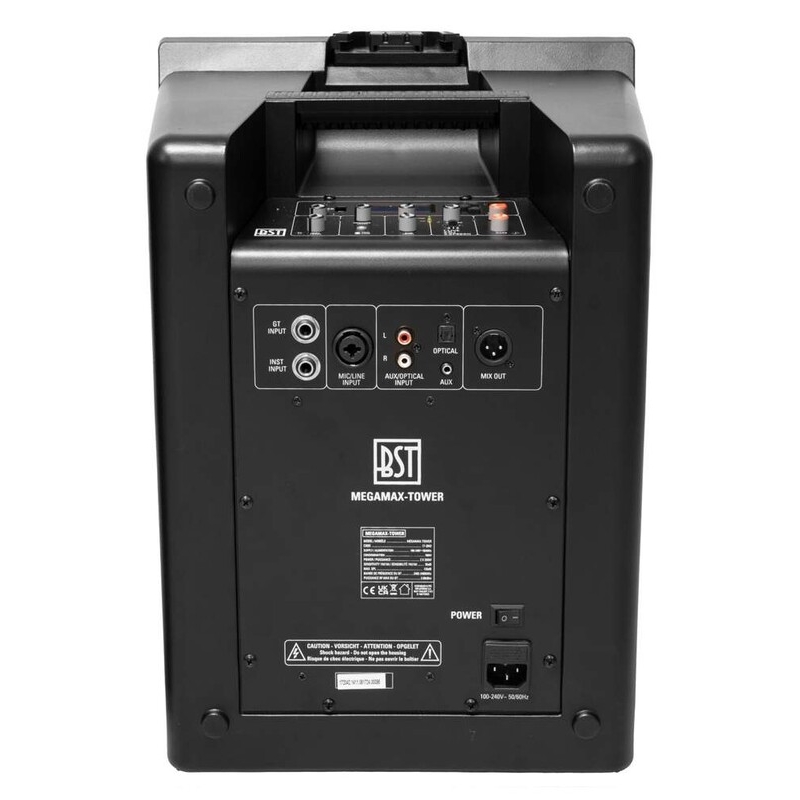 Aktívny ozvučovací systém pozostávajúci z aktívneho plastového subwoofera a zloženej plastovej pasívnej stĺpovej reprosústavy. Systém je určený pre hudobníkov, na ozvučenie prezentácií v zasadacích miestnostiach, pre DJ-ov atď.. Je navrhnutý pre rýchle a ľahké zostavenie pomocou vzájomne prepojených reproduktorov, ktoré sa do seba zacvaknú. Systém poskytuje plný a prirodzený zvuk. Bi-amp digitálny zosilňovač s výkonom 2x 350W RMS obsahuje DSP, ktorý umožňuje nastavenie pre optimálny výkon pomocou 3 presetov (LIVE, DJ, SPEECH). Subwoofer je osadený 10" hlbokotónovým reproduktorom a stĺpová sústava obsahuje 4x 1" stredotónové a 4x 1" výškové reproduktory s neodymovým magnetom. Exkluzívny systém zloženia reprosústavy a jej spojenia so subwooferom bez použitia káblov jednoduchým zasunutím. Má samostatné ovládanie hlasitosti jednotlivých vstupov. Obsahuje vstavaný USB/MP3 prehrávač s Bluetooth pripojením a diaľkovým ovládaním. Bluetooth obsahuje funkciu TWS pre stereo prepojenie dvoch systémov MEGAMAX-TOWER. Vstupy: 1x gitarový vstup (jack6,3mm), 1x inštrumentálny vstup (jack6,3mm), 1x MIC/LINE (kombo konektor XLR/Jack 6,3 mm), 1x stereo AUX vstup (2x RCA / jack3,5mm / digitálny optický Toslink). Výstupy: 1x MIX (XLR). Systém obsahuje 2-pásmové korekcie.