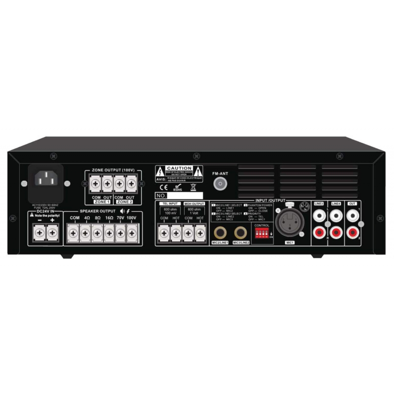 2-zónová rozhlasová ústredňa pre 100V s možnosťou nízkoimpedančného zapojenia 4-16Ω. Obsahuje vstupy: 1x MIC (XLR), 2x MIC/Line (jack6,3mm), 2x Line (2x RCA), 1x pre FM anténu, 1x TEL. Výstupy: 1x LINE (2x RCA), 4-16ohm/70V/100V, 2x 100V