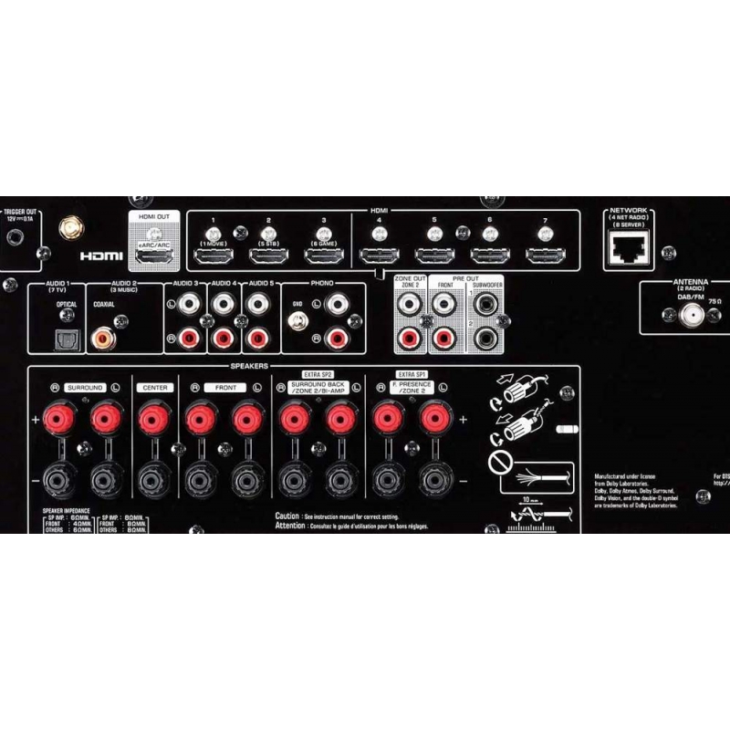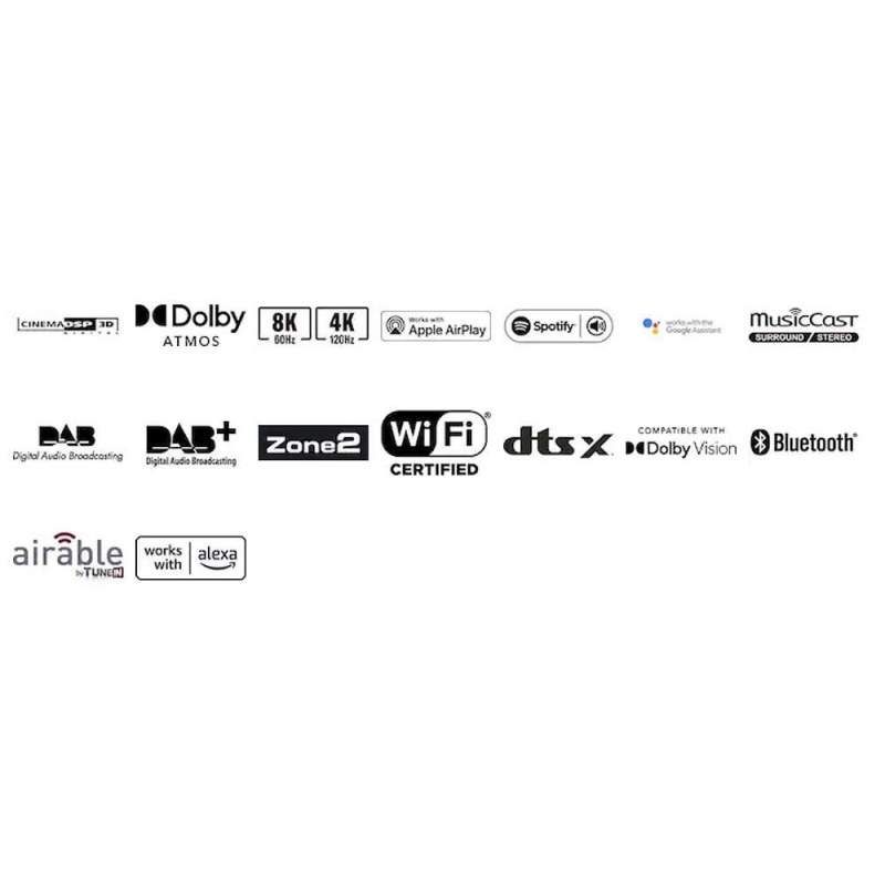 AV receiver 7.2, výkon 150 W/kanál, minimálna impedancia 8 Ohm, HDMI 7× vstup a 1× výstup, 1× optický vstup, 1× vstup koaxiálne audio, 1× vstup USB, WiFi, Bluetooth a AirPlay 2, podpora Dolby Atmos, ARC (Spätný zvukový kanál), DAB tune