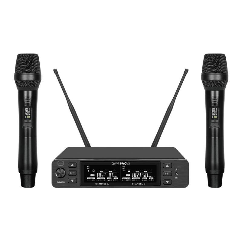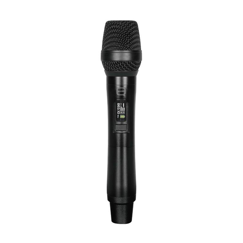 Veľmi kvalitný duálny diverzitný set bezdrôtových UHF mikrofónov. Obsahuje 2x ručný dynamický mikrofón a prijímač. Set ponúka perfektné riešenie za rozumnú cenu bez kompromisov v kvalite. Mikrofóny majú 16 voliteľných UHF frekvencií v rozsahu 863-865MHz. Na vysielačoch a prijímači sú stavové displeje, ktoré zobrazujú kanál, frekvenciu, stav batérií v mikrofónoch, silu signálu, indukátor audio signálu. Prijímač obsahuje automatické skenovanie voľných frekvencií. Bezdrôtové mikrofóny maju vynikajúci zvuk a veľký dosah. Ručný vysielač je napájaný 2x 1,5V AA batériou. Dosah viac ako 50m. Samostatná regulácia hlasitosti pre každý mikrofón. Samostatný symetrický XLR audio výstup pre každý mikrofón a nesymetrický zmixovaný Jack6,3mm audio výstup. Mikrofón je ideálny pre spev a hovorené slovo. Mikrofóny sú odolné proti spätnej väzbe. - Skreslenie: <0,1 % - Výdrž batérií (alkalických): Viac ako 5 hodín