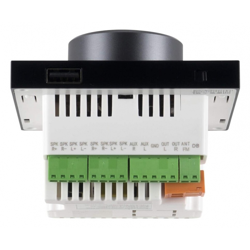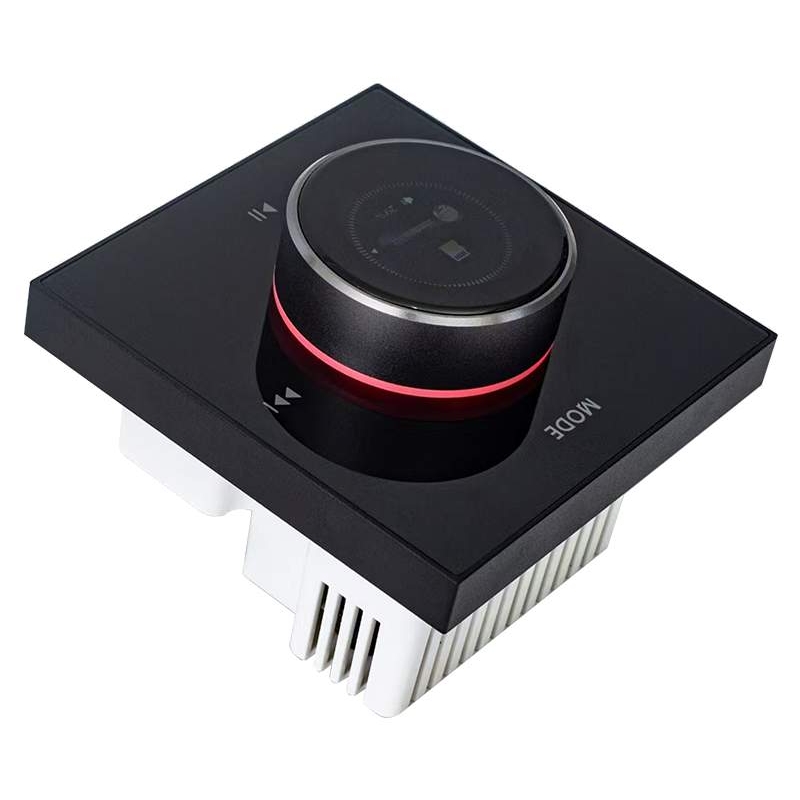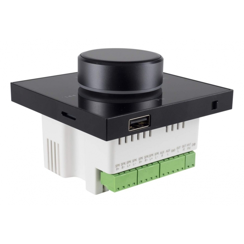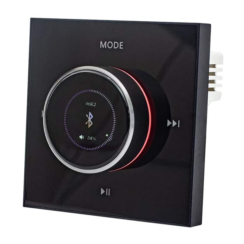 Kvalitný stenový USB/microSD/MP3 prehrávač s moderným dizajnom a jedinečným intuitívnym ovládaním. Okrem MP3 prehrávača obsahuje aj FM tuner, Bluetooth prijímač a vstavaný 4-kanálový digitálny zosilňovač s výkonom 4x 25W do 4ohm. V otočnom regulátore má jemný farebný okrúhly grafický LCD displej. Obsahuje tiež 1x stereo AUX vstup a výstup. K prehrávaču je dodávané IR diaľkové ovládanie. Montuje sa do montážnej krabičky (ktorá je súčasťou balenia) do steny ako vypínač na svetlo. Je vhodný na ozvučenie izby, kuchyne, kúpelne, kancelárie, baru, reštaurácie alebo telocvične. Pomocou priloženého ovládača je možné nastaviť aj presety ekvalizéra.