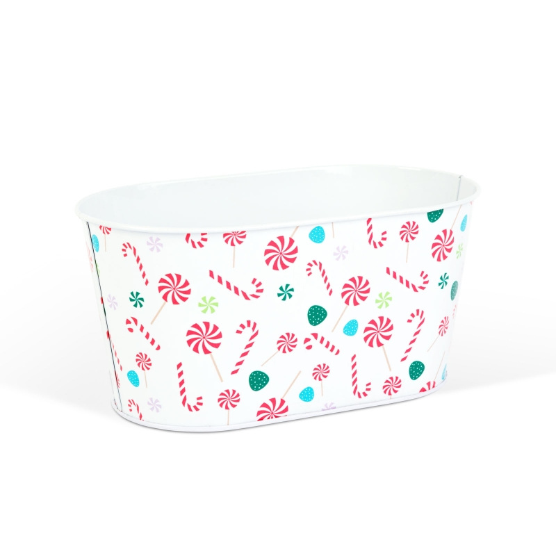 Tento veselý vianočný kovový košík so vzorom lízaniek je ideálnou voľbou na sviatočné obdobie! Môžete ho využiť na uloženie koláčikov, drobných darčekov, sladkostí alebo dekorácií. Pevný kovový materiál zaručuje odolnosť a farebný vzor vytvára sviatočnú atmosféru. Skvele vyzerá na stole, poličke či komode – jednoducho kdekoľvek!